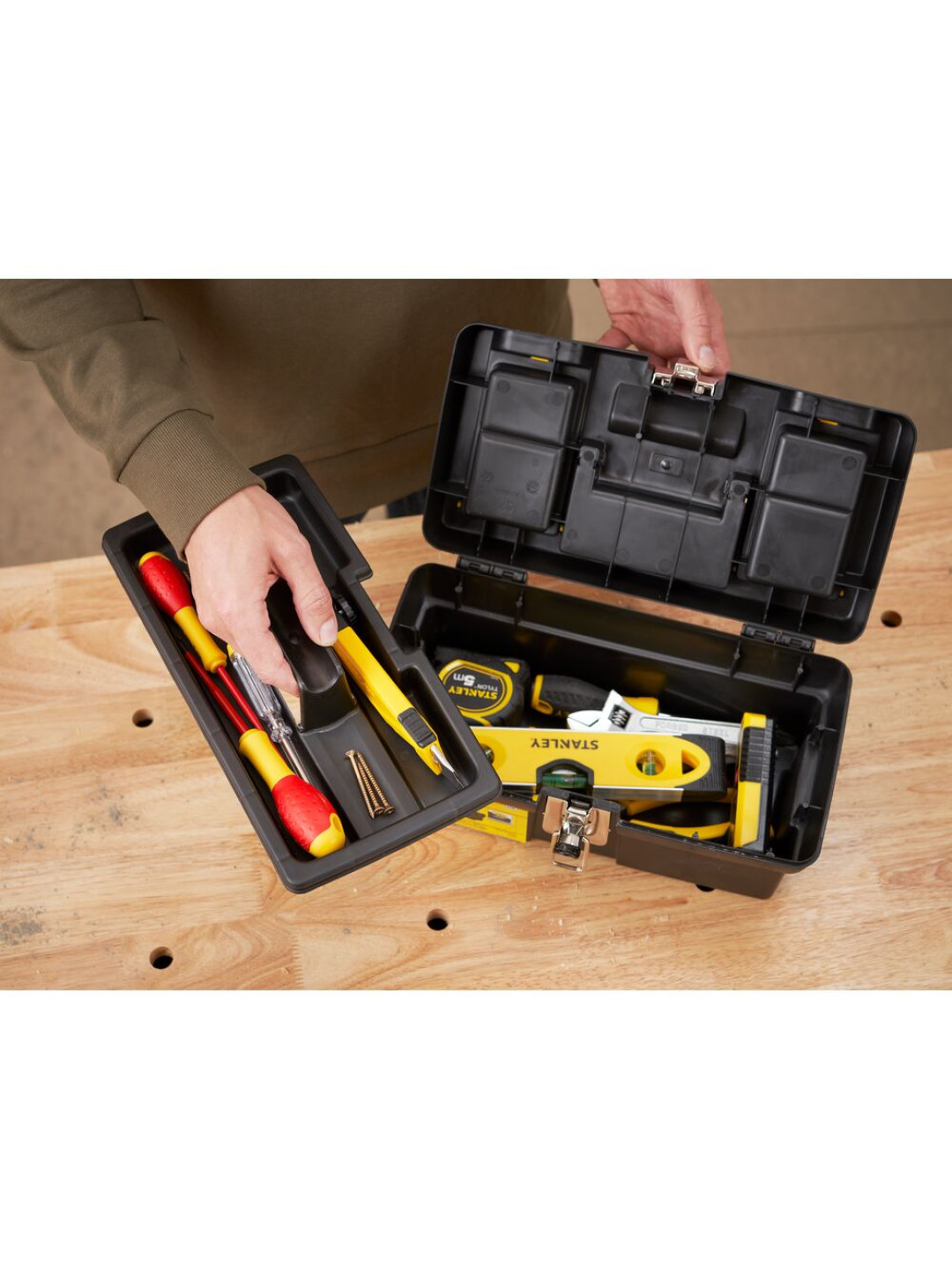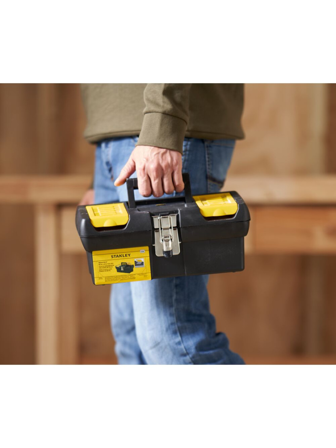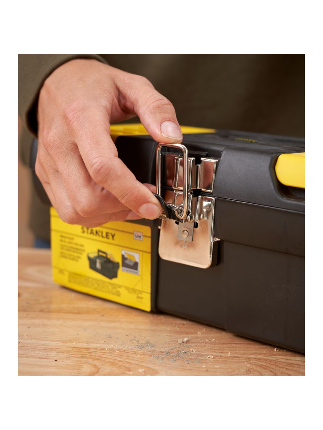 STANLEY 12,5 colių įrankių dėžė su metaline skląsčiu idealiai tinka kasdieniams būtiniausiems įrankiams laikyti. Ji turi du dangtelio organizavimo skyrius smulkioms dalims ir priedams, taip pat nuimamą dėklą mažesniems įrankiams ir komponentams. Komplektuojama su metaline skląsčiu patvarumui, spynos kilpa saugumui ir minkšta rankena lengvam transportavimui.