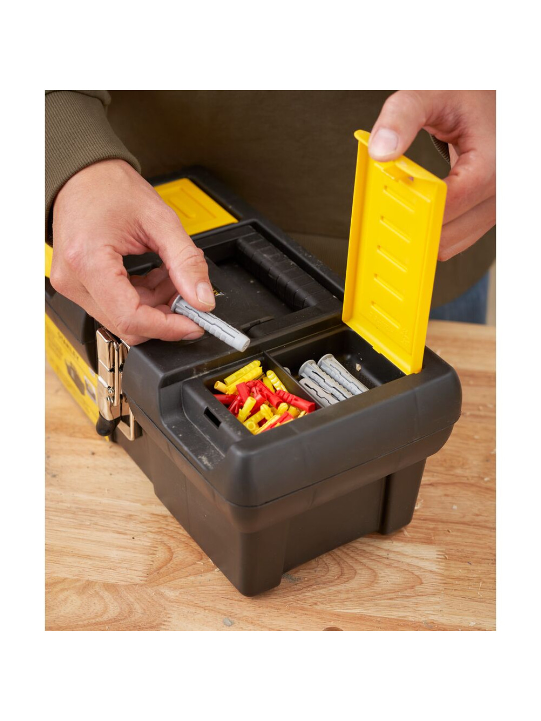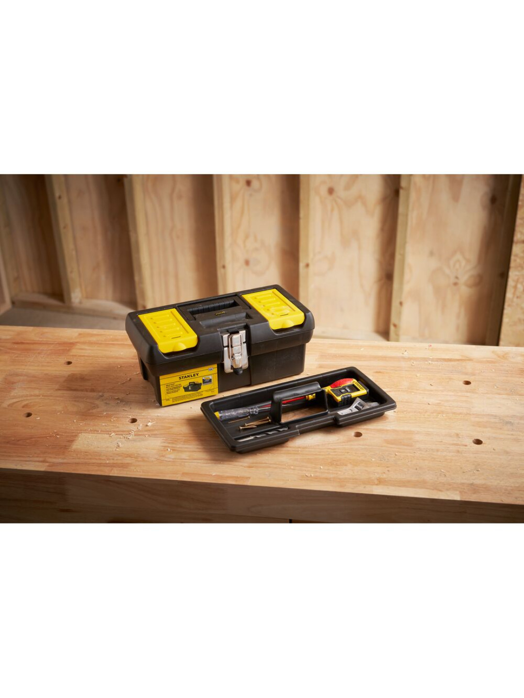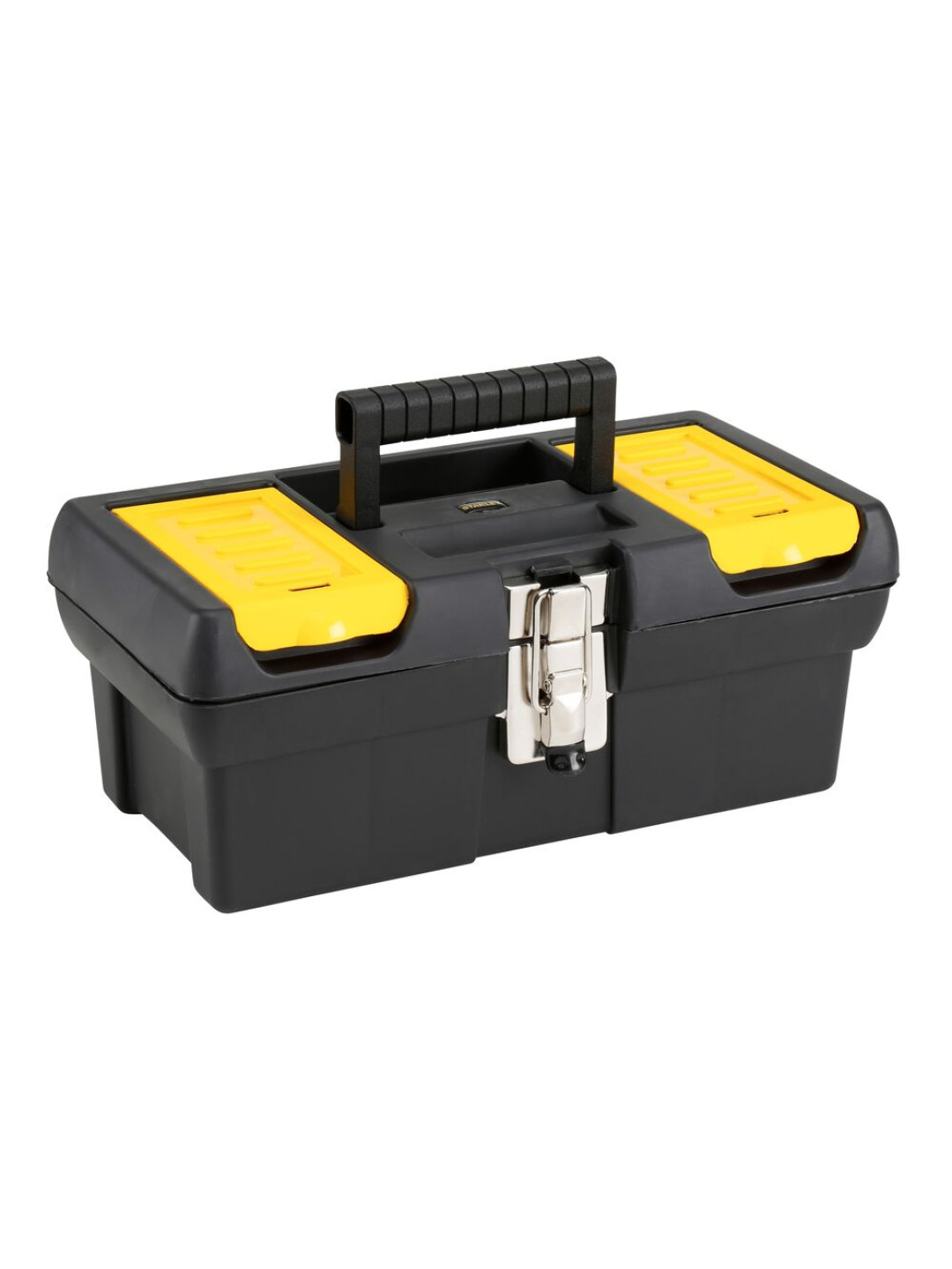 STANLEY 12,5 colių įrankių dėžė su metaline skląsčiu idealiai tinka kasdieniams būtiniausiems įrankiams laikyti. Ji turi du dangtelio organizavimo skyrius smulkioms dalims ir priedams, taip pat nuimamą dėklą mažesniems įrankiams ir komponentams. Komplektuojama su metaline skląsčiu patvarumui, spynos kilpa saugumui ir minkšta rankena lengvam transportavimui.