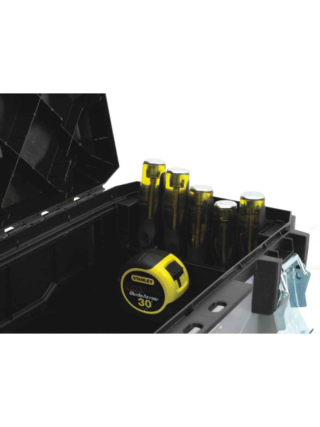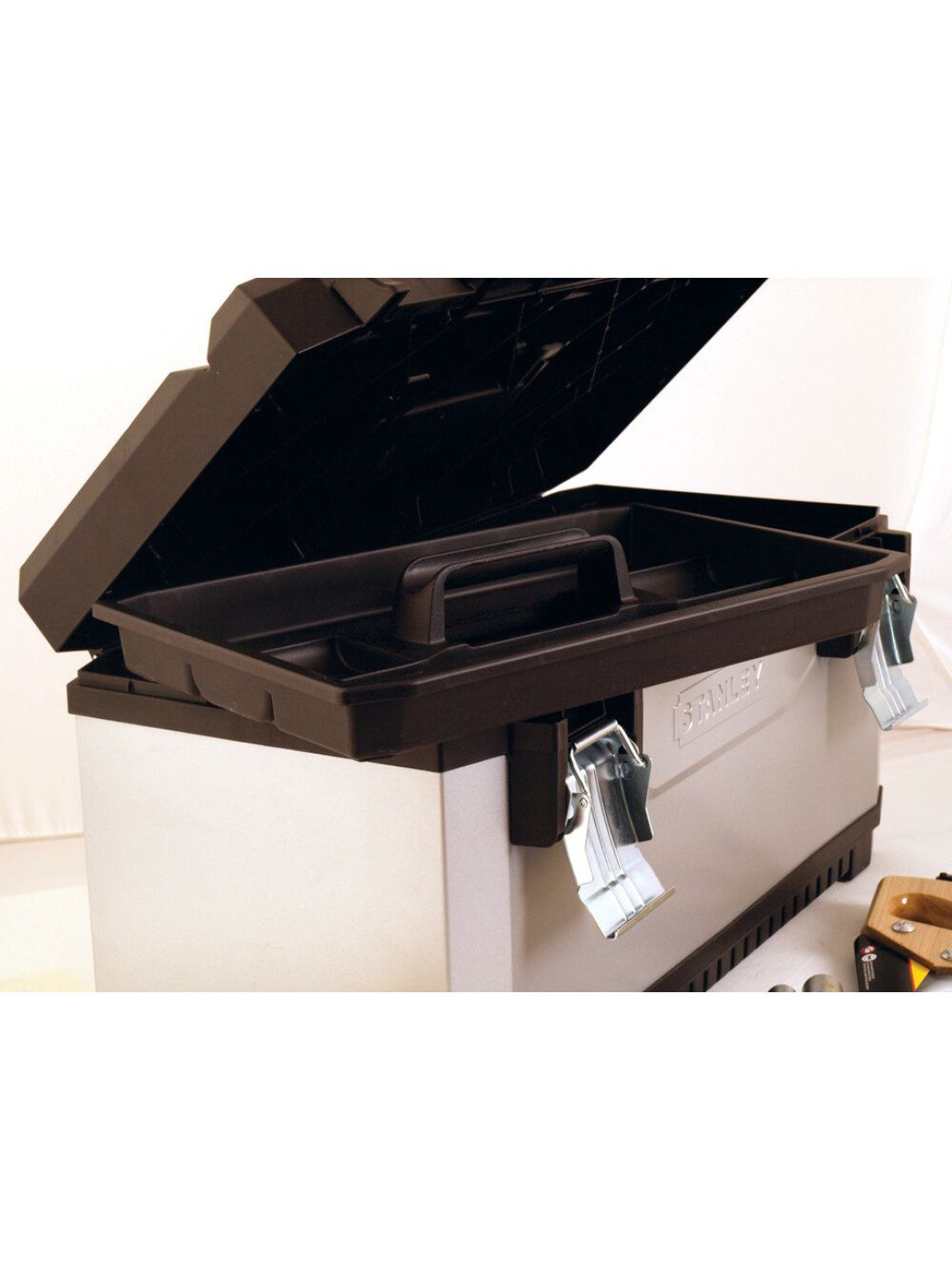 STANLEY FATMAX 20 colių metalinė plastikinė įrankių dėžė idealiai tinka įrankiams ir priedams laikyti. Įrankių dėžė pagaminta iš metalo ir plastiko, kad būtų patvari, ir turi metalinius nerūdijančius skląsčius. Joje yra nuimamas dėklas mažesniems įrankiams ir komponentams laikyti, o dangtelyje – integruotas V formos griovelis vamzdžiams ir medienai pjauti. Įrankių dėžė turi nešiojimo rankeną, kad būtų lengva transportuoti, ir spynos kilpą saugumui užtikrinti.