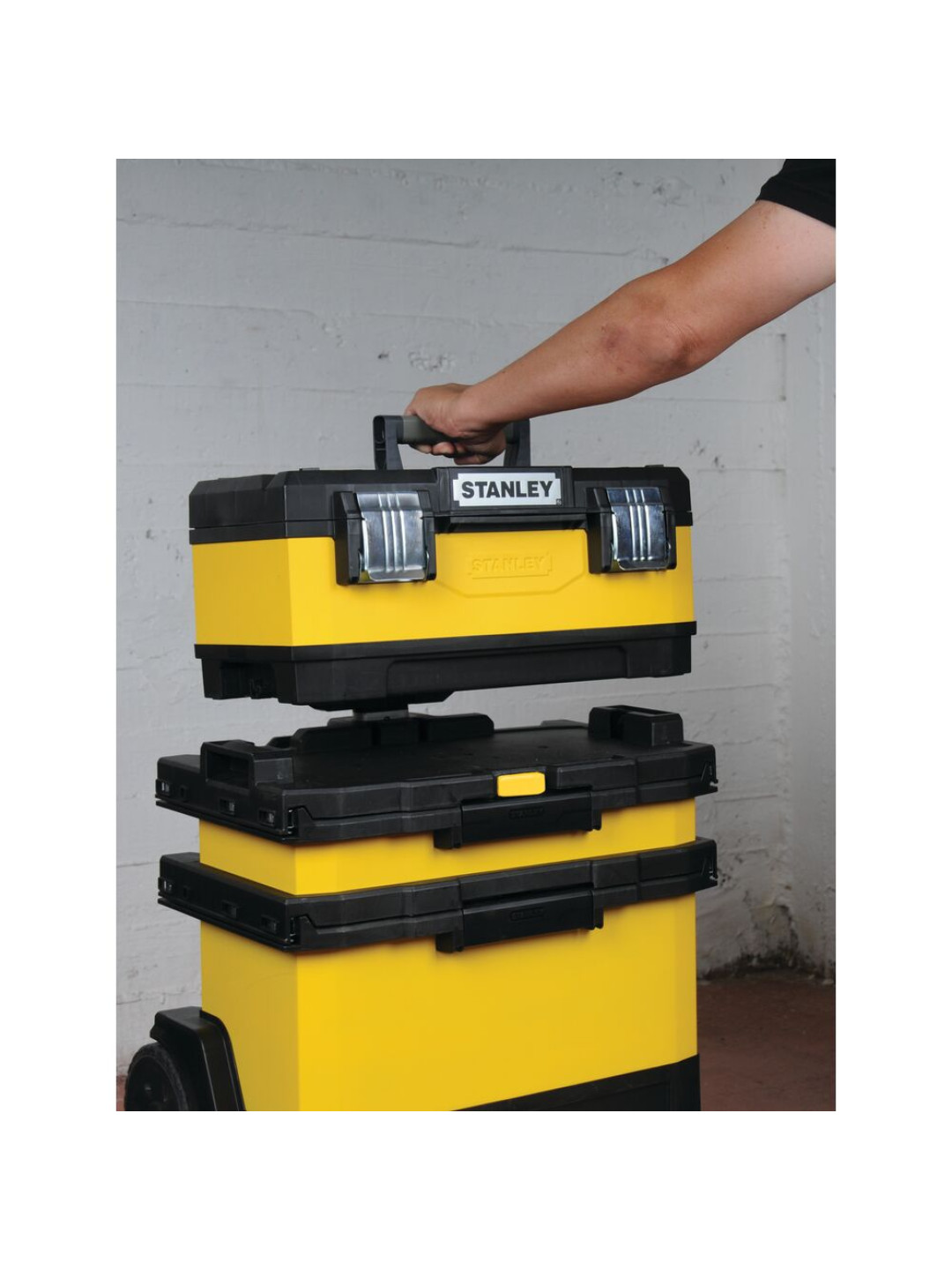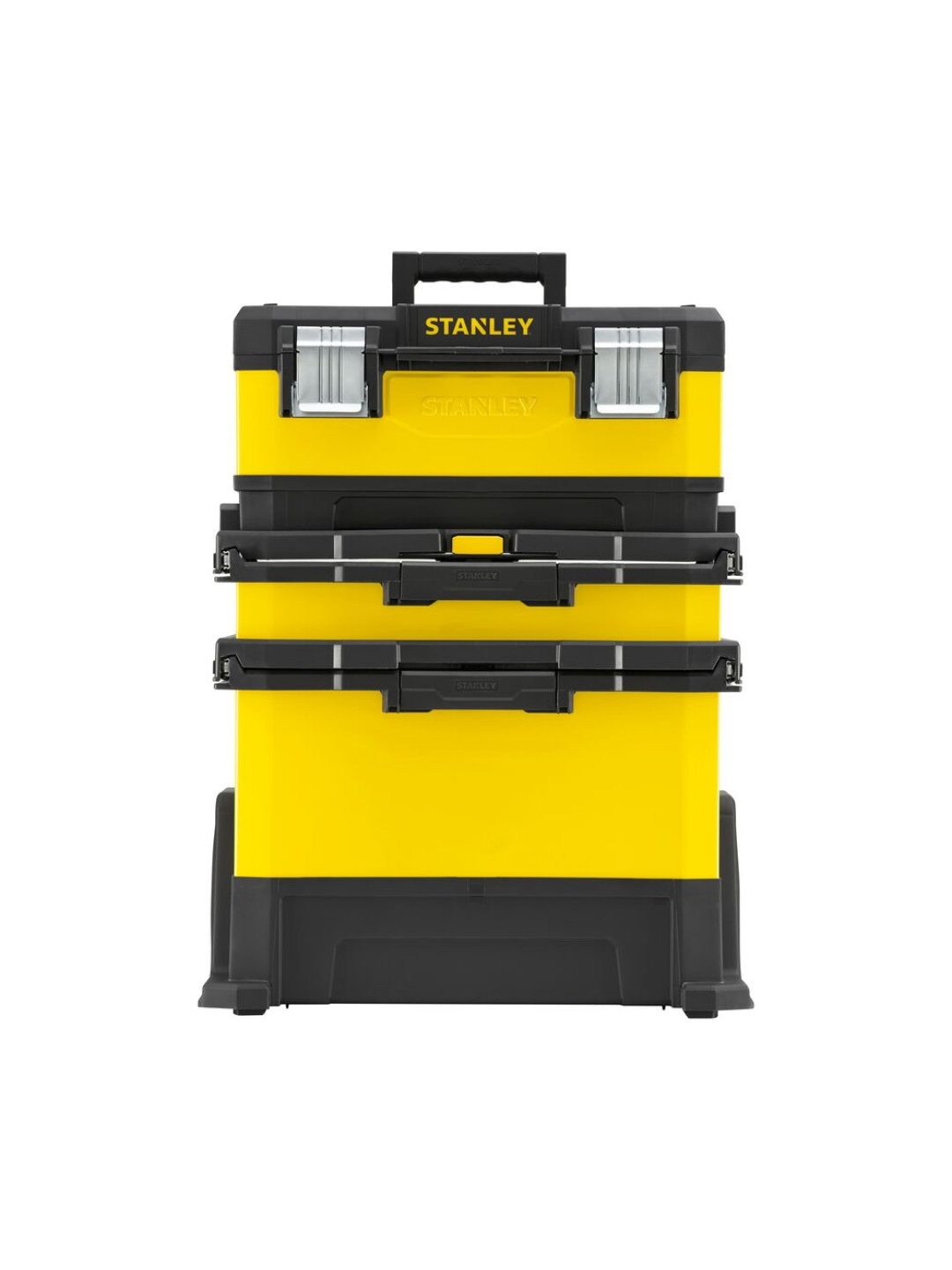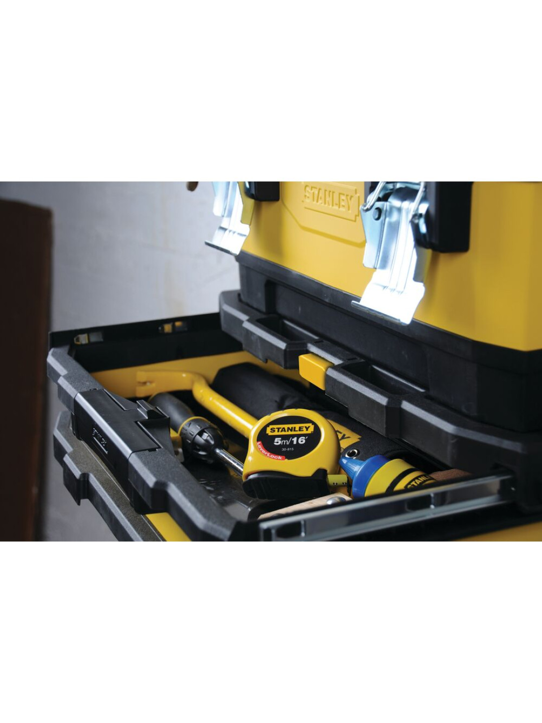 STANLEY metalinis-plastikinis riedamųjų dirbtuvių sprendimas su metaliniais skląsčiais yra nešiojamas dirbtuvių sprendimas su giliu stalčiumi su rutuliniais guoliais, negiliu stalčiumi ir nuimama įrankių dėže – todėl jis idealiai tinka elektriniams įrankiams, rankiniams įrankiams, smulkioms dalims ir priedams laikyti. Jis pasižymi konsoliniu dizainu, kuris suteikia greitą ir lengvą prieigą prie 3 įrankių ir dalių lygių. Įrankių dėžėje yra vidinis, nešiojamas dėklas mažiems rankiniams įrankiams laikyti, taip pat integruotas V formos griovelis medienai, vamzdžiams ir plastikiniams vamzdeliams laikyti ir pjauti. Komplekte yra spynos kilpa saugumui, teleskopinė traukimo rankena lengvam transportavimui ir tvirti ratukai, užtikrinantys patvarumą ir stabilumą net ant nelygių paviršių.