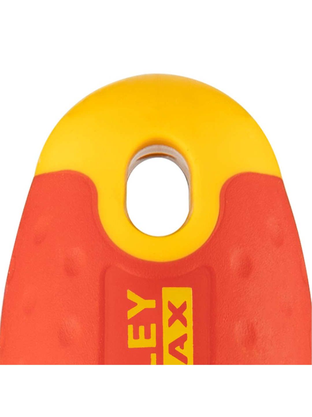 Sukurtas ir pagamintas pagal tikslias specifikacijas STANLEY gamybos įmonėje Arbois mieste, Prancūzijoje, STANLEY FATMAX izoliuotas griovelių 5,5 mm x 150 mm atsuktuvas yra įmonės aukštos kokybės profesionalių VDE sertifikuotų atsuktuvų asortimento dalis, pasižyminti stipriai izoliuota konstrukcija, specialiai sukurta aukštos įtampos įrenginiams aptarnauti. STANLEY FATMAX izoliuotas griovelių 5,5 mm x 150 mm atsuktuvas yra patvirtintas VDE instituto naudoti iki 1000 V įtampos įrenginiuose. Pagamintas iš tvirto anglinio silicio plieno, kad būtų tvirtesnis, našesnis ir ilgiau tarnautų, šis tvirtas ir patikimas elektriko įrankis pasižymi +100 % ilgesniu antgalio tarnavimo laiku*. Antgalis yra grūdintas, nuvalytas smėliasrove ir apdorotas juoda fosfato danga. Jis taip pat yra tiksliai apdirbtas, kad galvutė ir tvirtinimo detalė tiksliai atitiktų tvirtinimo detalę.