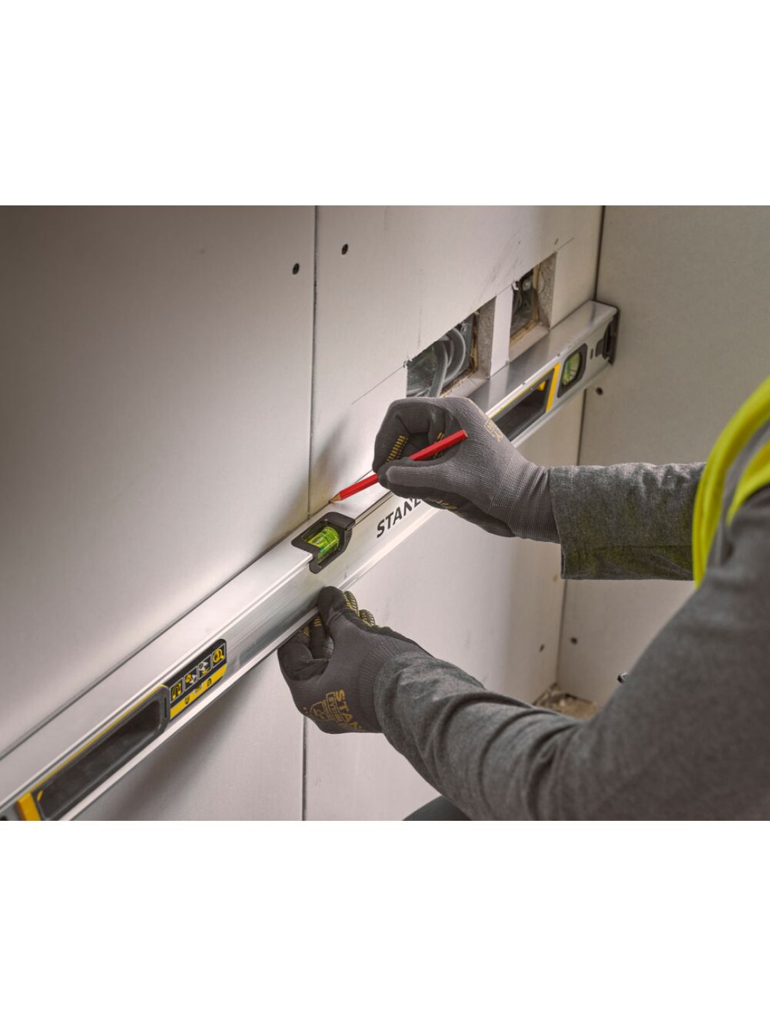 STANLEY FATMAX XTREME™ dėžiniai gulsčiukai sukurti taip, kad būtų patvarūs ir tikslūs, suteikdami jums reikiamą našumą kiekvienam darbui. Patentuotas ištisinis kraštas leidžia nubrėžti nepertraukiamas linijas per visą gulsčiuko ilgį. Smulkiai frezuotas pirminis kraštas užtikrina 0,5 mm/m tikslumą, o antrinio krašto – 0,8 mm/m. Visiškai apsaugota gulsčiukų technologija sukurta siekiant apsaugoti gulsčiukus nuo kritimo pažeidimų, o 90 % didesnis svambalo gulsčiukas suteikia lengviau matomą burbulą geresniam matomumui. Smūgius sugeriantys galiniai dangteliai yra guminiai, kad apsaugotų gulsčiuką nuo kritimo pažeidimų, ir turi iškilusias neslystančias paviršiaus apsaugas, kurios padeda apsaugoti nuo slydimo ir paviršiaus žymėjimo. Be to, galinius dangtelius galima nuimti, todėl 90 laipsnių žymėjimas ir kampų linijos tampa lengvesnės ir tikslesnės. Taip pat yra strategiškai išdėstyti pirštų turėklai, kad būtų lengviau naudoti viena ranka ir geresnis ergonominis dizainas. Specializuotiems darbams, pavyzdžiui, gipso kartono konstrukcijoms, yra magnetinių gulsčiukų versijų, kurios aprūpintos stipresniais retųjų žemių magnetais nei ankstesni modeliai.