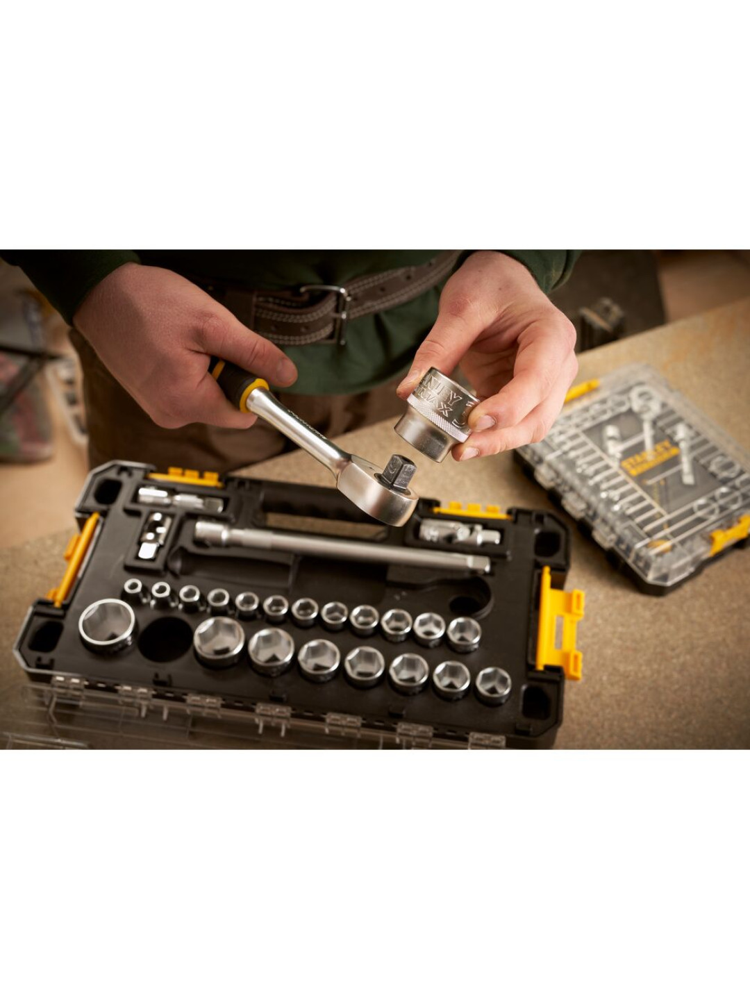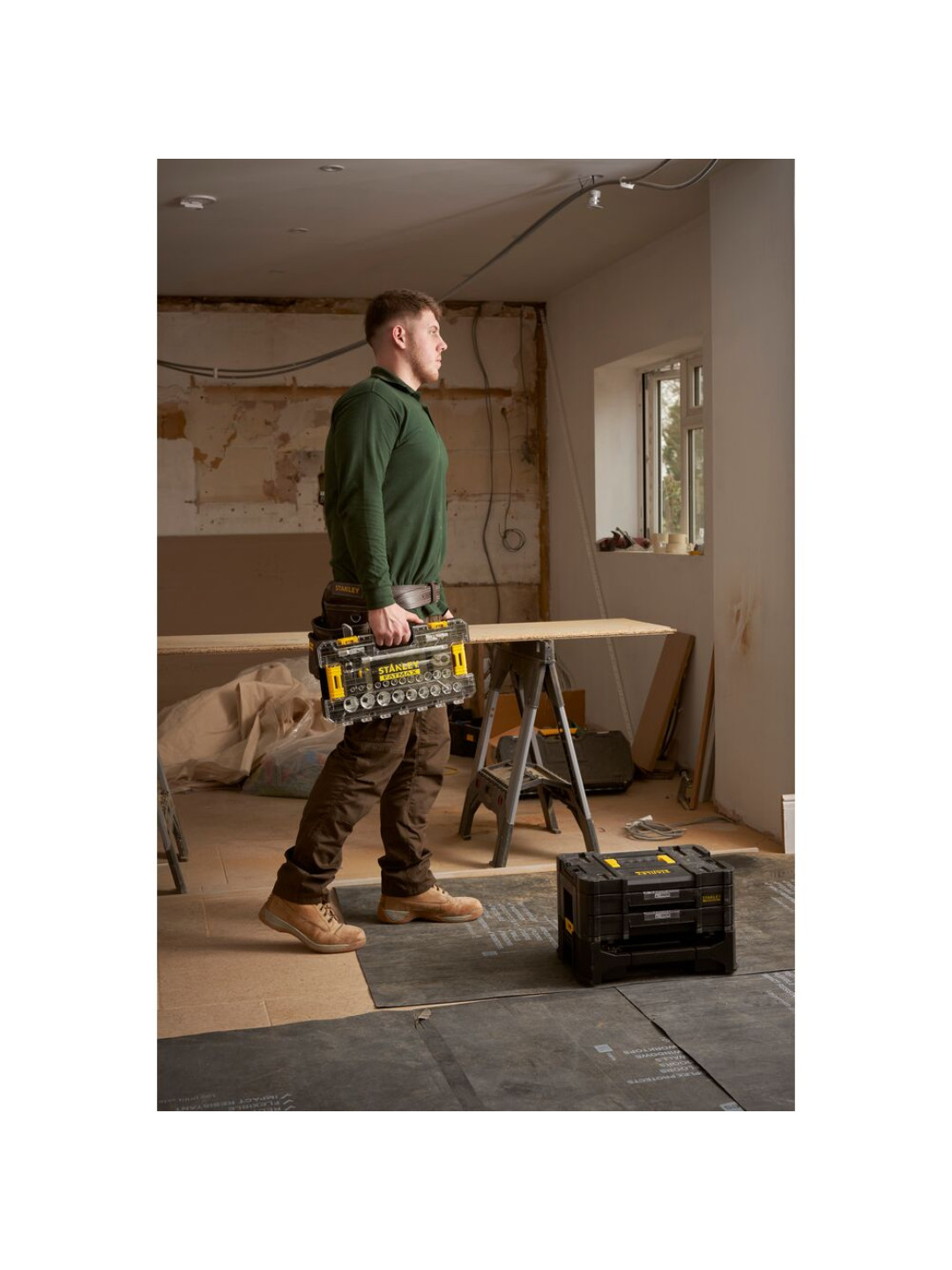 STANLEY FATMAX ½ colio L PRO-STACK VERŽLIŲ RINKINYS (26 vnt.) yra visiškai prijungiamas ir suderinamas su STANLEY FATMAX PRO-STACK saugojimo sprendimu. Tvirtinamas prie didesnio PRO-STACK korpuso, šis modulis siūlo tikrai mobilų ir saugų sprendimą jūsų mechanikos įrankiams. Turi: permatomą dangtelį, per kurį turinys yra visiškai aiškus; 120bi medžiagos terkšlę; sudarytą iš 120 smulkiai dantytų, 3° žingsnių, kurie leidžia didesnį užveržimo pajėgumą ir tikslumą dirbant siaurose erdvėse; X formos „Maxidrive“ galvutes; su grioveliais, kad būtų lengviau paimti ir naudoti galvutę; kaklelio žemyn konstrukcija, kad būtų lengviau naudoti ankštoje aplinkoje; „Maxidrive“ profilį, kad būtų kuo geriau sujungtas galvutė ir veržlė, ir matomus matmenis, kad būtų lengva nustatyti galvutės dydį.