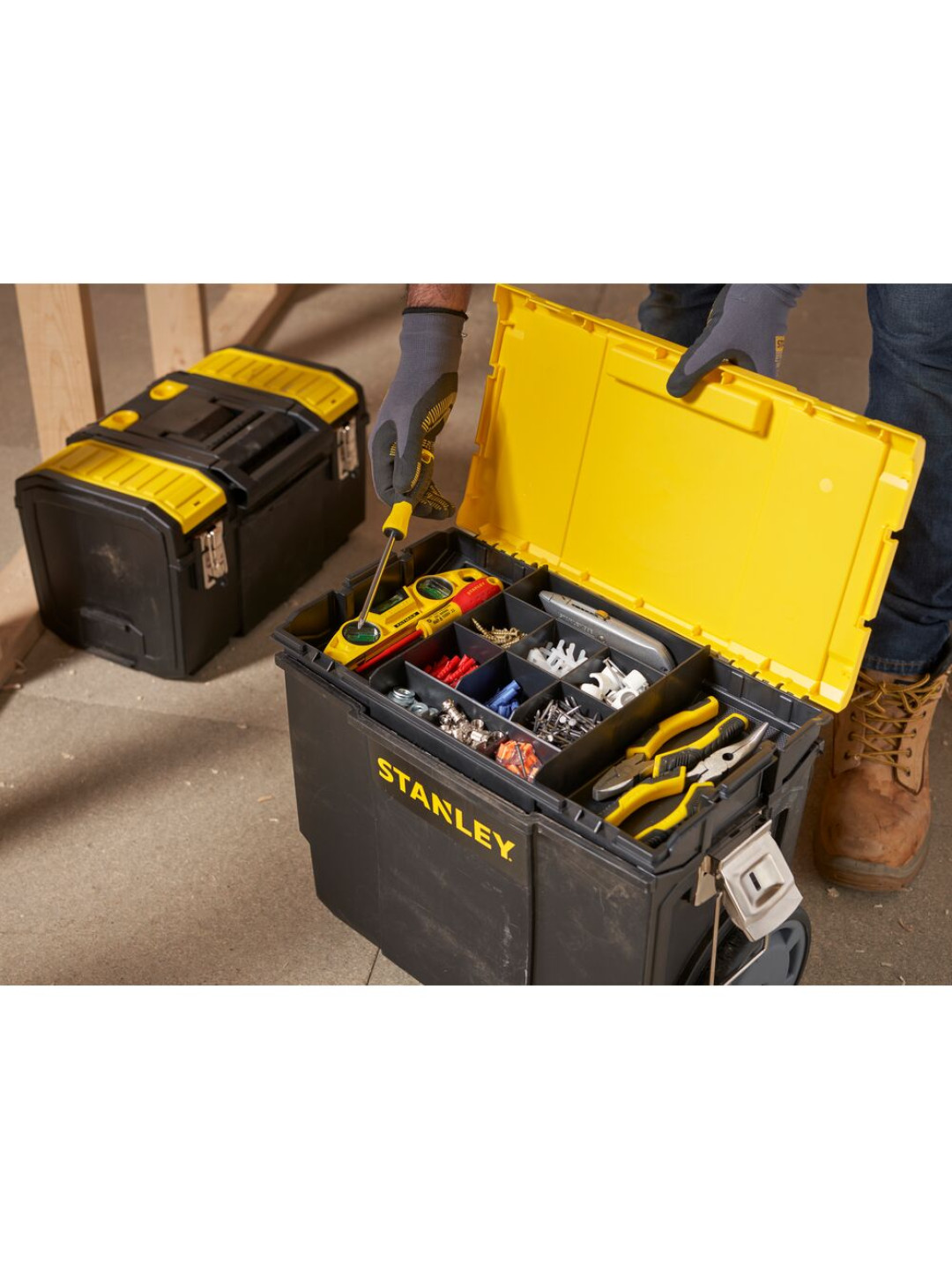 „STANLEY 3-in-1 Mobile Work Center™“ – tai nešiojamas dirbtuvių sprendimas, kurį sudaro itin didelė dėžė, vidutinio dydžio nuimama įrankių dėžė ir nuimamas organizatorius, todėl jis idealiai tinka elektriniams įrankiams, rankiniams įrankiams, smulkioms dalims ir priedams laikyti. Įrankių dėžėje yra du dangtelio organizatoriaus skyriai smulkiems priedams laikyti, taip pat vidinis, nešiojamas dėklas smulkiems rankiniams įrankiams nešiotis. Nuimamas organizatorius idealiai tinka smulkioms dalims ir komponentams laikyti. Kiekvieną dirbtuvių dalį galima sujungti naudojant didelius metalinius šoninius skląsčius. Komplekte yra spynos kilpa saugumui užtikrinti, teleskopinė traukimo rankena lengvam transportavimui ir 7 colių ratukai patvarumui ir stabilumui užtikrinti net ant nelygių paviršių.