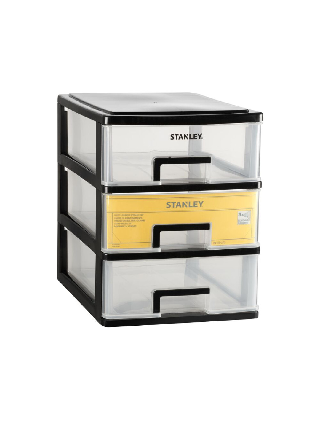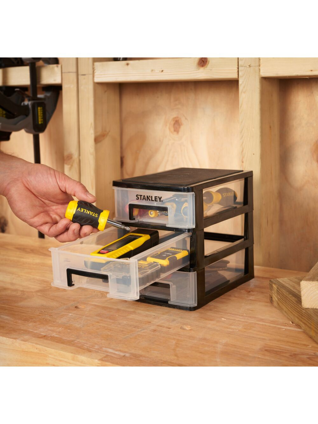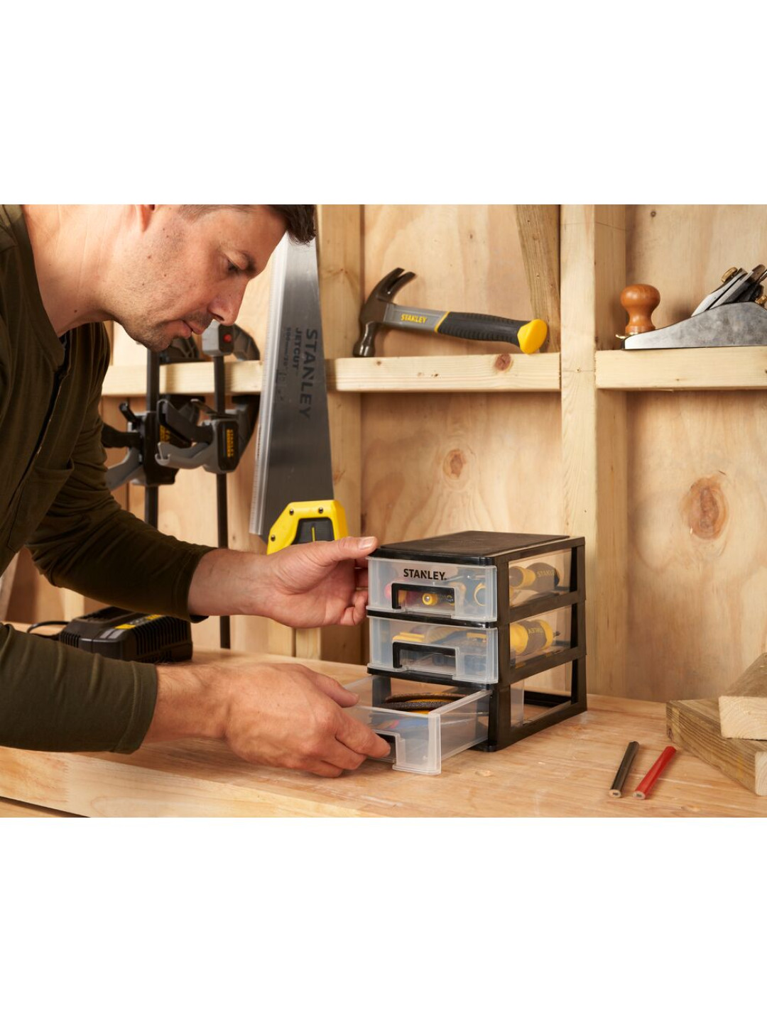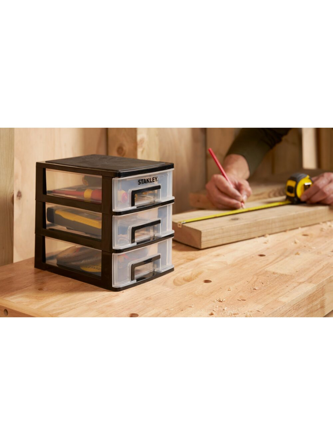Mažas STANLEY daiktadėžė su 3 stalčiais idealiai tinka tvarkingai laikyti smulkias detales, tvirtinimo detales ir priedus. Jame yra permatomi stalčiai, kad būtų galima aiškiai matyti turinį, taip pat išimami stalčiai, kad būtų lengva pasiekti detales. Lengva ir kompaktiška konstrukcija, idealiai tinka naudoti dirbtuvėse ir garažuose.