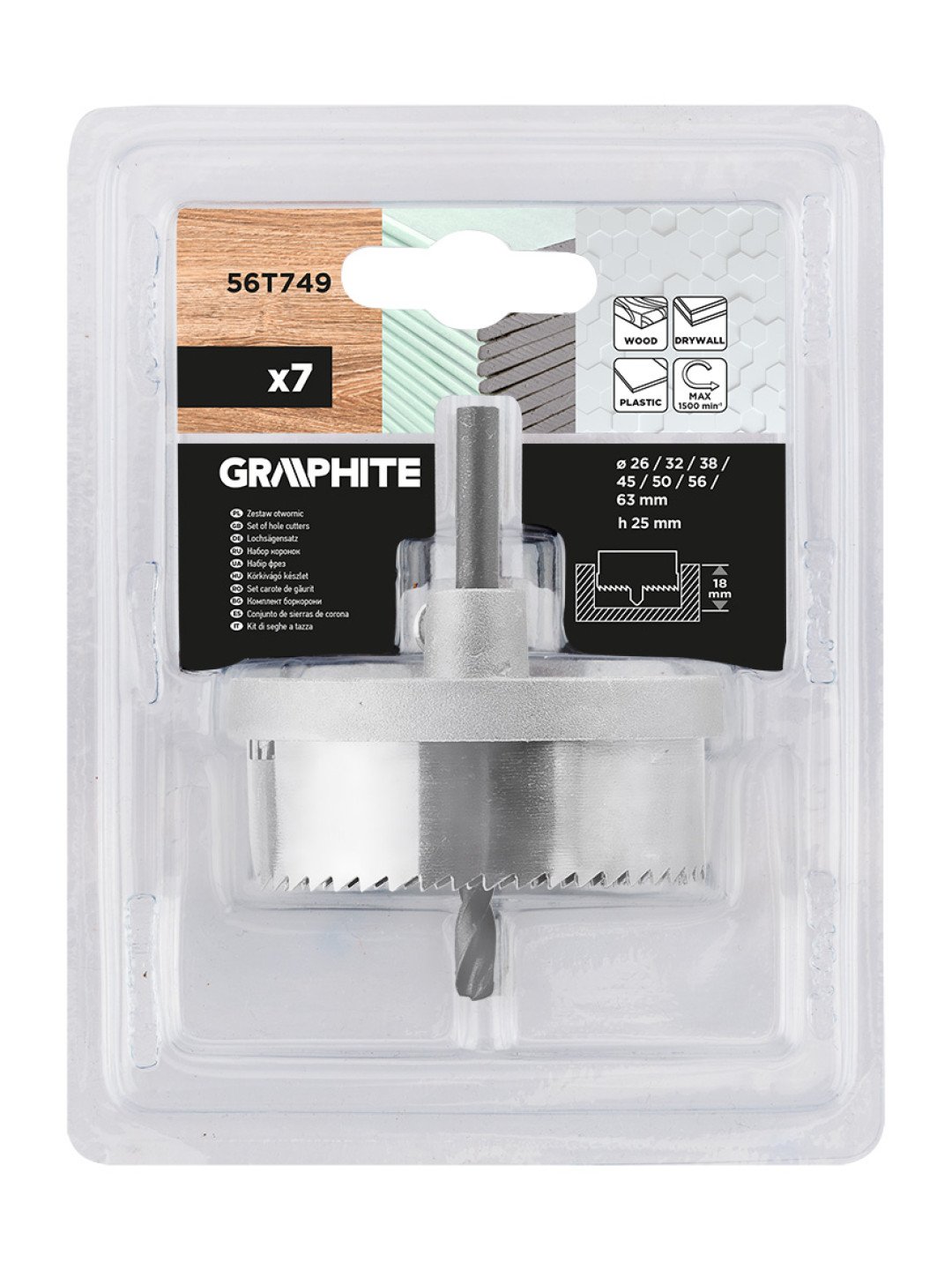Medienos skylių pjūklai 26–63 mm, H 25 mm, 7 gabalų rinkinys 56T749 pagal grafitą yra rinkinys, kuriame yra 7 gabalai su skersmens: 26, 32, 38, 45, 50, 56 ir 63 mm. Kiekvienos skylės pjūklo aukštis yra 25 mm, o maksimalus gręžimo gylis yra 18 mm. Maksimalus sukimosi greitis yra 1500 aps / min. Produktas yra skirtas gręžti medienoje, gipso plokštelėje ir plastikoje.