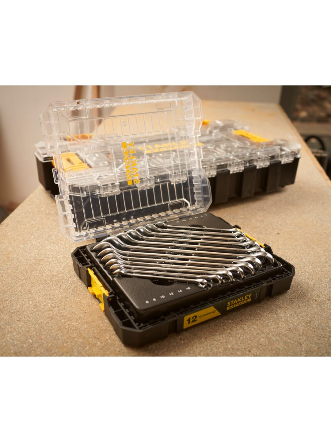 „STANLEY FATMAX“ kombinuotų raktų M PRO-STACK rinkinys (12 vnt.) yra visiškai suderinamas ir su „STANLEY FATMAX PRO-STACK“ saugojimo sistema. Tvirtinamas prie didesnio „PRO-STACK“ korpuso, šis modulis siūlo tikrai mobilų ir saugų sprendimą jūsų mechanikos įrankiams. Kieto dėklo savybės: skaidrus dangtis, užtikrinantis visišką turinio matomumą, patvari konstrukcija, užtikrinanti tvirtą veikimą bet kokioje darbo aplinkoje, ir kompaktiški matmenys, kad būtų lengva transportuoti ir laikyti. Turinys apima: neslidų profilį, kuris užtikrina geresnį varžtų kontaktą ir apsaugą nuo slydimo, 12 taškų universalų dėžutės galą, kad būtų lengva uždėti ant veržlių ir varžtų, 15° atvirą ir dėžutės galą, pagerinantį prieinamumą, kokybišką dizainą, pagamintą iš korozijai atsparaus chromo vanadžio plieno su matinio chromo apdaila.